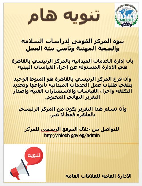 الـعمل وأضراره فى مـختلف قــطاعات النشـاط الإقتصـادى وَعـمل قياسـات بيئيـة وَفـحوَص طبيــة وَاقــتراح التـصميمات الـهندسية.